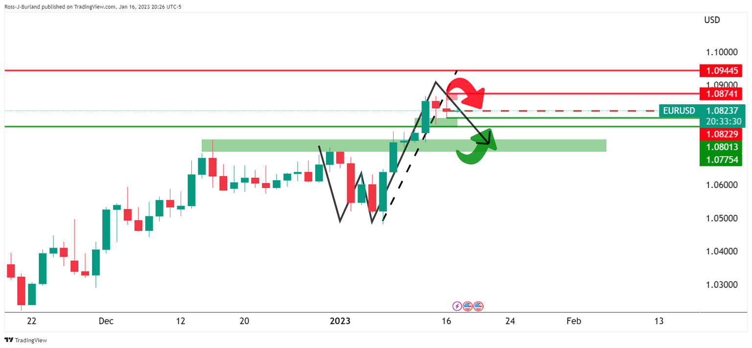 Meanwhile, the euro is under pressure on Tuesday, falling from a high of 1.0869 to a fresh low of 1.0786 in a move signified in prior analysis as follows: