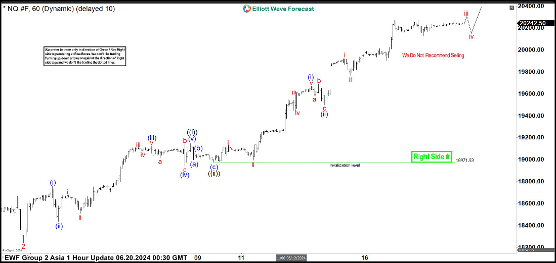 Short term Elliott Wave in Nasdaq Futures (NQ) suggests that cycle from 4.19.2024 low is in progress as an impulse. Up from 4.19.2024 low, wave 1 ended at 19023.25 and pullback in wave 2 ended at 18241.25. Wave 3 higher is currently in progress with subdivision of an impulse in lesser degree. Up from wave 2, wave (i) ended at 18755.50 and pullback in wave (ii) ended at 18435.75. The Index rallied higher in wave (iii) towards 19124.5 and dips in wave (iv) ended at 18940. Final leg wave (v) ended at 19155 which completed wave ((i)).