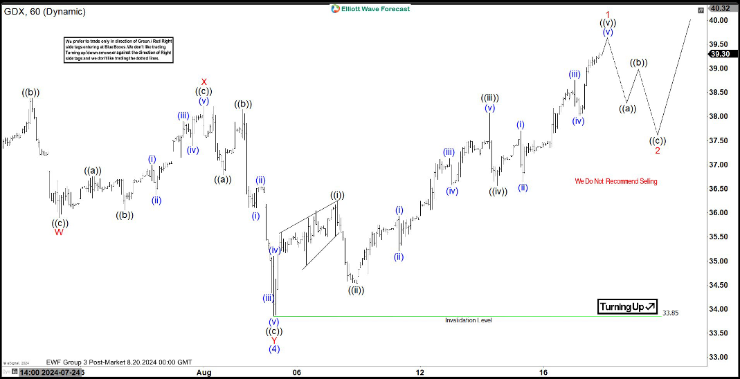 Rally from 9.26.2022 low in $GDX is currently in progress as a 5 waves diagonal. Up from 9.26.2022 low, wave (1) ended at 36.26 and pullback in wave (2) ended at 25.62. The ETF then extended higher in wave (3) towards 39.4 and pullback in wave (4) ended at 33.85 as the 1 hour chart below shows. Internal subdivision of wave (4) unfolded as a double three Elliott Wave structure. Down from wave (3), wave W ended at 35.9 and wave X ended at 38.22. Wave Y lower ended at 33.85 which completed wave (4) in higher degree.