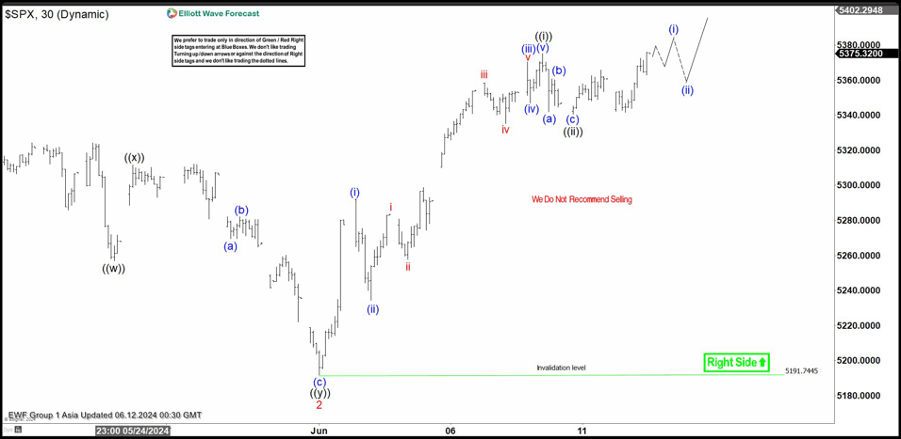 Short term Elliott Wave in S&P 500 (SPX) suggests the rally from 4.20.2024 low is in progress as an impulse. Up from 4.20.2024 low, wave 1 ended at 5341.88 and pullback in wave 2 ended at 5191.68. Internal subdivision of wave 2 unfolded as a double three Elliott Wave structure. Down from wave 1, wave ((w)) ended at 5256.93 and wave ((x)) ended at 5311.65. The Index then extended lower in wave ((y)) as a zigzag structure. Wave (a) ended at 5269.67, wave (b) ended at 5282.06 and wave (c) ended at 5191.74. This completed wave ((y)) of 2 in higher degree.