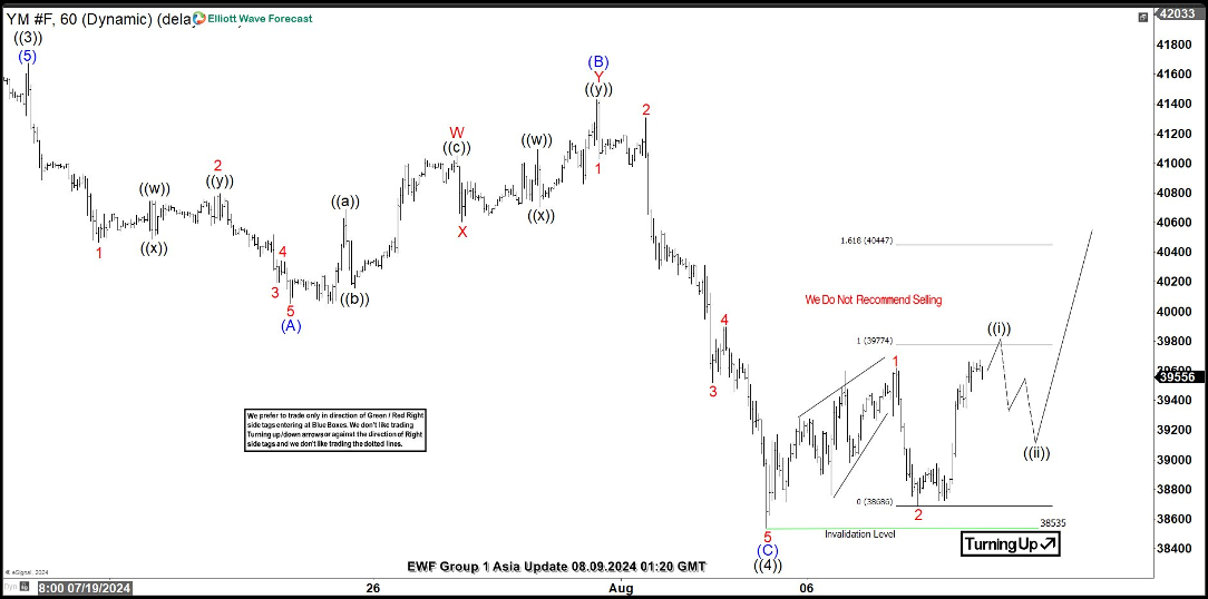 YM_F begins a big correction in July 18 high. Down from wave ((3)), the index did an impulse structure to complete a wave (A) at 40053 low. Then, the market did a bounce developing a double correction as wave (B). Up from wave (A), wave W ended at 41051 high. The connector (X) ended at 40606 low and last push higher completed wave (Y) at 41427 and also wave (B). The market resumed to the downside forming another impulse as wave (C) of ((4)). It placed 1 of (C) at 41028 low, 2 at 41305 high, 3 at 39518 low, 4 at 39880 high and finally 5 at 38541 to complete wave (C) and wave ((4)). While price action stays above 38541 low, we are calling for more upside to continue the rally as wave ((5)).