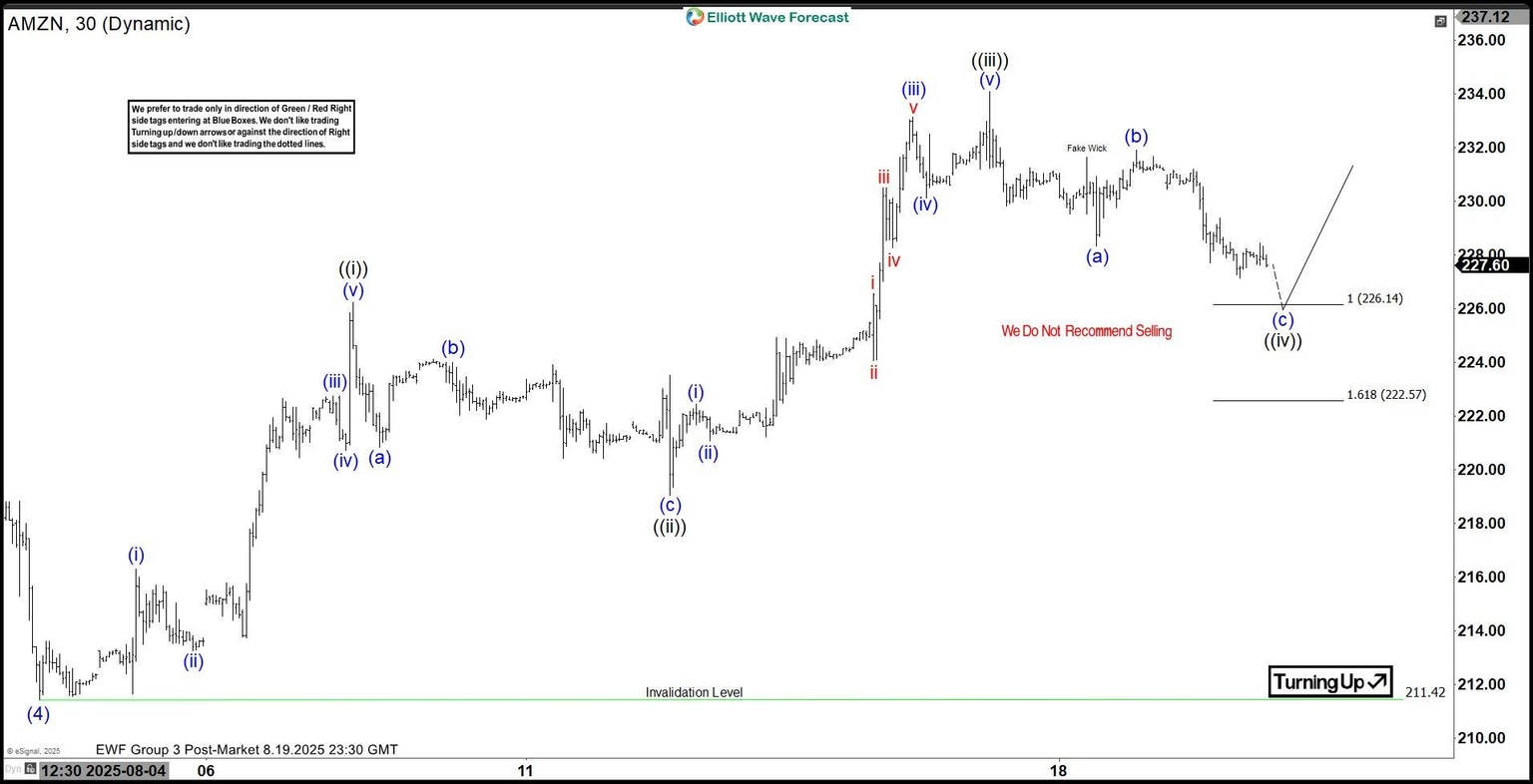 Amazon (AMZN) continues its cycle from the August 2025 low, unfolding as a five-wave impulse in the Elliott Wave framework. From that low, wave (i) peaked at $216.30, followed by a shallow pullback in wave (ii) to $213.25. The stock then surged in wave (iii) to $222.75, with a brief dip in wave (iv) concluding at $220.71. The final leg, wave (v), reached $226.22, completing wave ((i)) in a higher degree. A correction in wave ((ii)) followed, bottoming at $219.05.