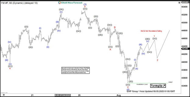 The Dow Futures (YM) cycle, initiated from the April 2025 low, has reached a mature phase and could conclude soon. We anticipate one final push higher to complete the impulsive cycle from that low. As shown on the one-hour chart, wave (3) of this impulse peaked at 45,312. The subsequent wave (4) pullback concluded at 43,467, forming a zigzag Elliott Wave structure. From wave (3), wave A dropped to 44,418, wave B rallied to 44,852, and wave C fell to 43,467, finalizing wave (4). The Index has since turned upward in wave (5), but it must surpass the wave (3) high of 45,312 to eliminate the possibility of a double correction.
