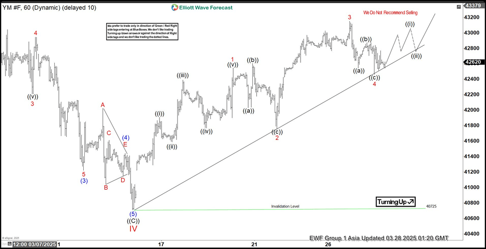 The short-term Elliott Wave perspective for Dow Futures (YM) indicates that the wave IV pullback concluded at 40725, as illustrated in the 1-hour chart below. The Index has begun to climb in wave V. However, it must still surpass the prior peak of 45227, set on January 31, 2025, to eliminate the possibility of a double correction downward. The rally from the wave IV low has so far unfolded in three swings. For greater confidence in continued upward momentum, it’s advisable to wait until a five-swing pattern emerges.