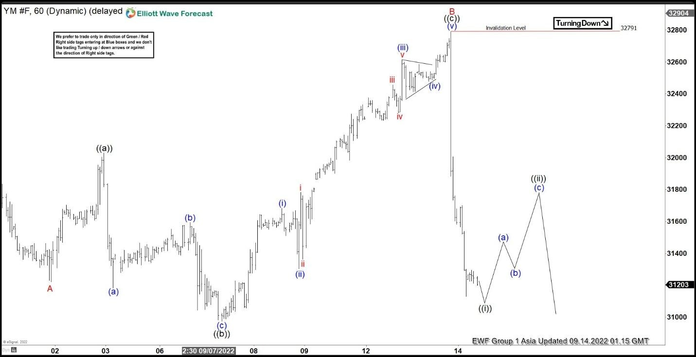 Up from wave ((b)), wave (i) ended at 31681 and pullback in wave (ii) ended at 31303. Index extended the rally higher in wave (iii) towards 32612, dips in wave (iv) ended at 32488 as triangle, and final leg higher wave (v) ended at 32791 which completed wave ((c)) of B. YM has started to turn lower in wave C. Internal subdivision of wave C should unfold in 5 waves. Expect wave ((i)) of C to end soon with a marginal low, then Index should rally to correct cycle from 9.13.2022 high in 3, 7, or 11 swing in wave ((ii)) before turning lower again. As far as pivot at 32791 high stays intact, expect rally to fail in 3, 7, 11 swing for further downside.