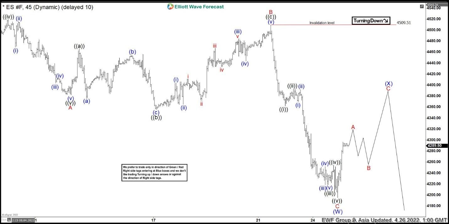 Short term Elliott Wave view in S&P 500 E-mini Futures (ES) suggests cycle from March 30, 2022 has ended in wave (W) at 4195.25. The internal subdivision of wave (W) unfolded as a zigzag Elliott Wave structure. Down from March 30 peak, wave A ended at 4382.25 and rally in wave B ended at 4509.51. Index then extended lower in wave C towards 4195.25 which completed wave (W). Wave (X) corrective rally is currently in progress to correct cycle from March 30 peak in a larger degree 3, 7, or 11 swing before Index resumes the decline lower.