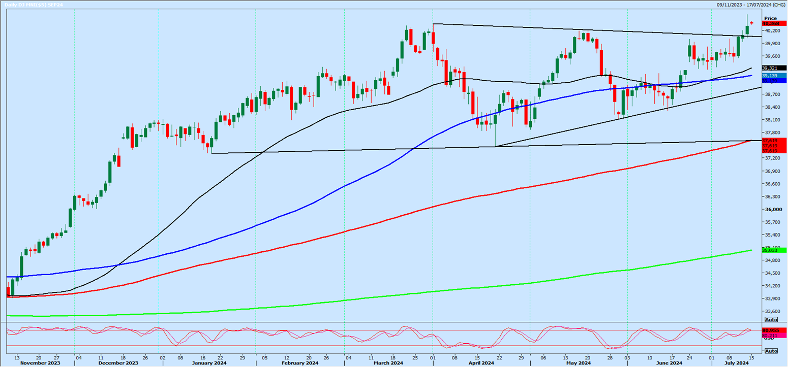 Emini Dow Jones September futures shot higher to a new all time high at 40572