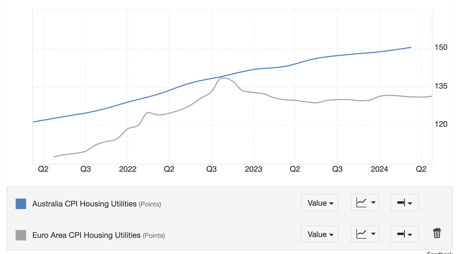 The Consumer Price Index (CPI) for Housing and Utilities is another metric that is showing a wide divergence between the Eurozone and Australia. In the former, the metric began falling in Q3 of 2022 whilst in Australia it continues to rise.