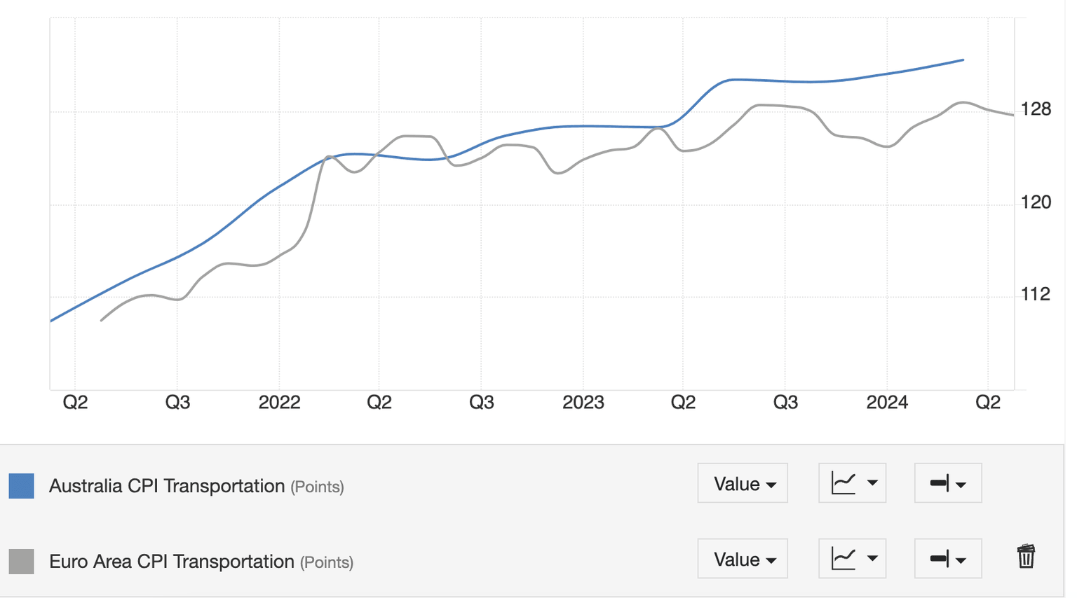 Australian Transportation CPI continues to steadily rise whilst it is plateauing in the Eurozone.