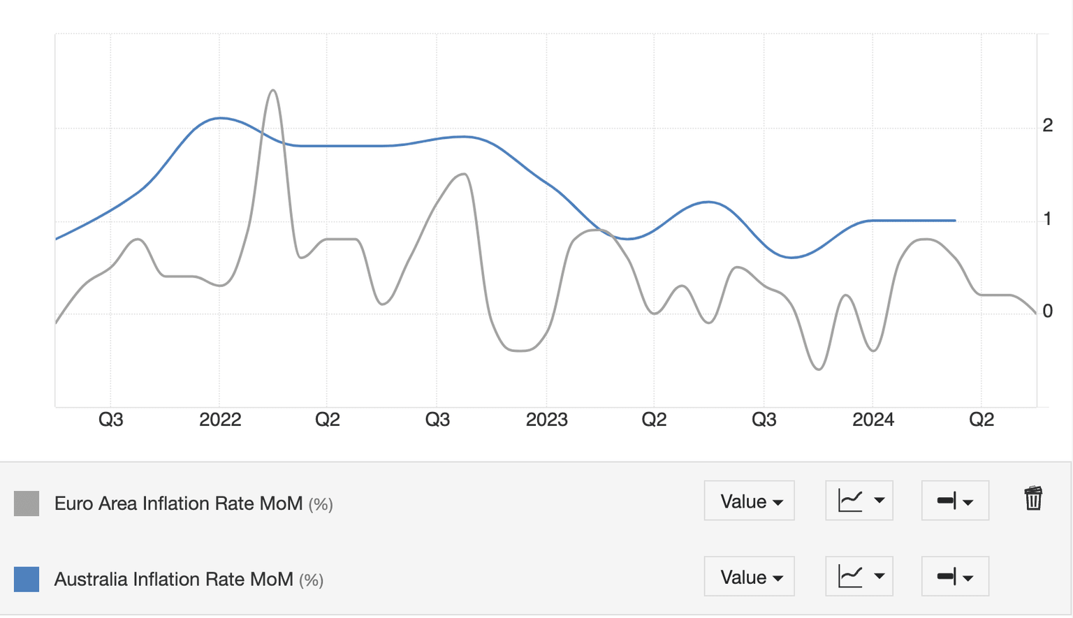 This is most clearly seen in a comparison of the inflation rate on a month-over-month basis, which shows Australian inflation recovering at the same time as Eurozone inflation has fallen to zero.