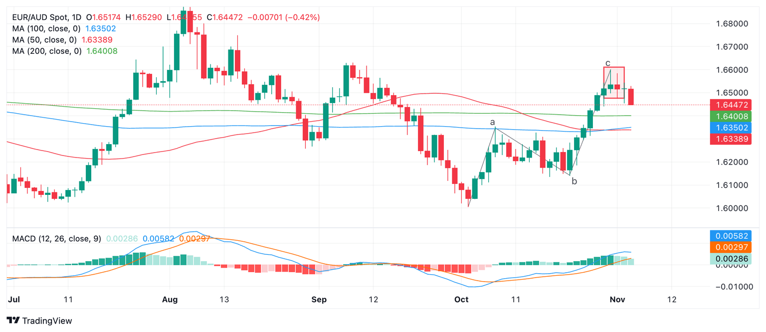 EUR/AUD has started to fall after forming a bearish Shooting Star Japanese candlestick reversal pattern (red-shaded rectangle on chart below) as it peaked on October 31.