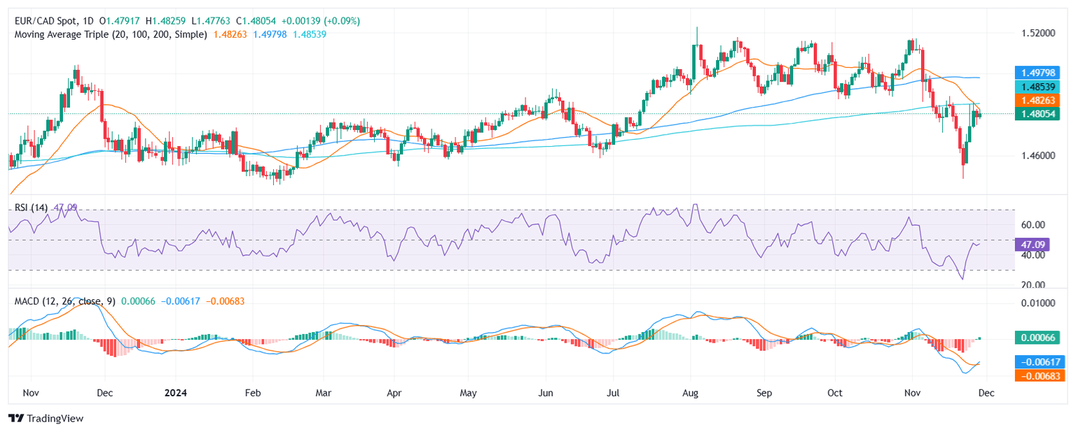 The EUR/CAD pair saw a slight uptick in Friday's session, climbing by 0.26% to reach 1.4825. However, despite this modest gain, the pair remains below its 20-day Simple Moving Average (SMA), having recently completed a bearish crossover between the 20 and 200-day SMAs. While buyers attempt to reclaim the 20-day SMA, indicators suggest a struggle, with the Relative Strength Index (RSI) recovering buying pressure and the Moving Average Convergence Divergence (MACD) indicating rising buying pressure and overall bullish momentum.