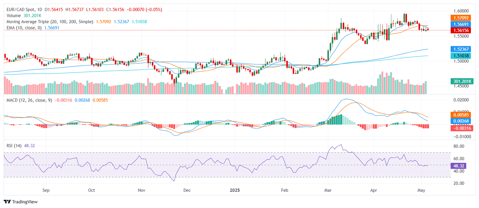 The EUR/CAD pair edged lower on Tuesday, hovering near the 1.5600 area after the European session as the pair retreated within the day’s range. Although the move reflects mild selling pressure, the broader trend structure remains favorable for buyers, particularly when viewed through the lens of longer-term averages. Short-term signals remain mixed, keeping directional conviction limited for now.