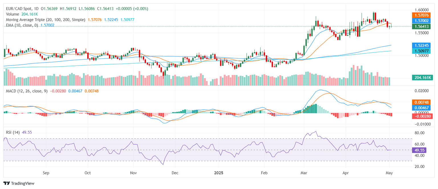 The EUR/CAD pair hovered near the 1.5600 zone on Friday after the European session, showing little change on the day but maintaining a steady bullish bias overall. Price action remains confined to the middle of the daily range, reflecting ongoing consolidation. While short-term signals show hesitation, the broader outlook is supported by strong trend-based indicators positioned below current levels.
