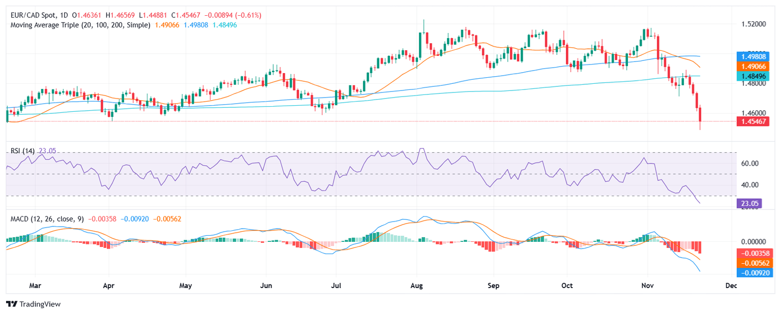 Technical indicators on the EUR/CAD currency pair continue to paint a bearish picture, as evidenced by the pair's sharp decline in recent sessions and the ongoing four-day losing streak. The Relative Strength Index (RSI) has entered the oversold territory, with a current reading of 21, indicating that selling pressure is intensifying. The RSI's downward slope further suggests that the bearish momentum is gaining strength. The Moving Average Convergence Divergence (MACD) also supports this view, as it remains negative and is trending upwards, signaling a bearish outlook.