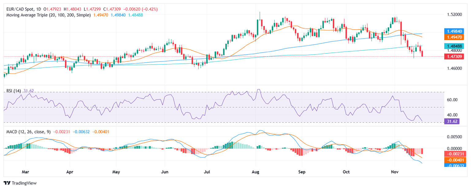 The EUR/CAD fell by 0.29% on Wednesday, reaching a low of 1.4745, continuing its decline and reaching lows last seen in July. The bearish trend is supported by negative technical indicators, with the Relative Strength Index (RSI) and Moving Average Convergence Divergence (MACD) indicating selling pressure and bearish momentum.