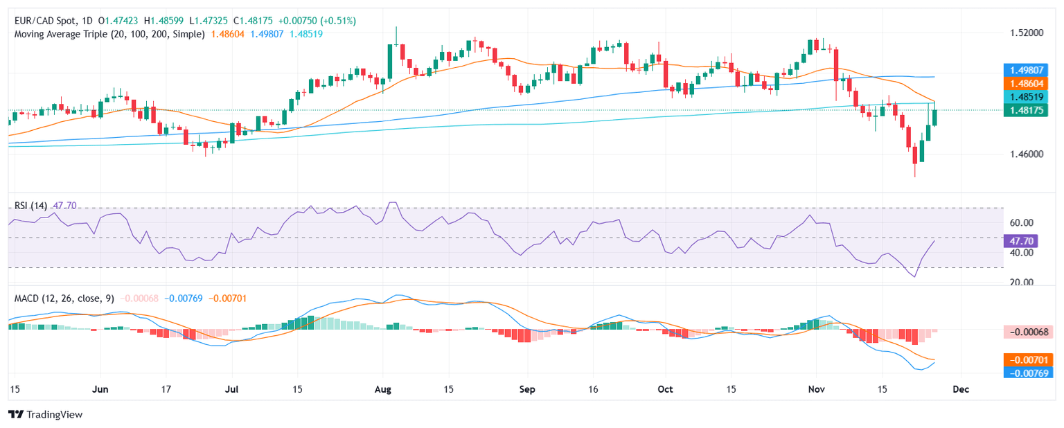 The EUR/CAD rose by 0.51% to 1.4815 in Wednesday's session and is on its way to test the 200-day Simple Moving Average (SMA) following a jump in the early part of the day. The cross has made a new stride to conquer the key 200-day SMA at 1.4850 which in case of conquering it would improve the outlook. The Relative Strength Index (RSI) is recovering, while the Moving Average Convergence Divergence (MACD) is rising, suggesting that the overall momentum is mixed.