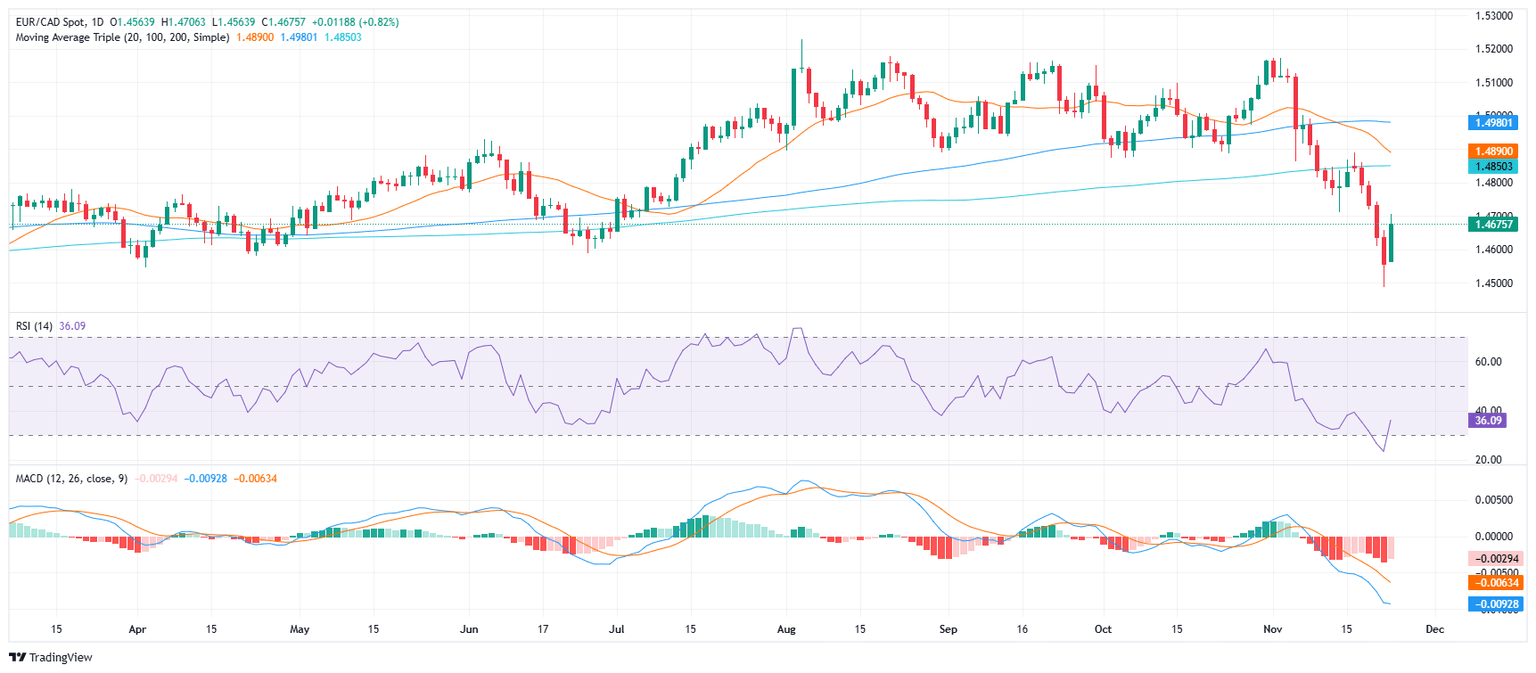 The EUR/CAD snapped its four-day losing streak on Monday, rising by 0.87% to 1.4690. The pair seems to be consolidating after a furious losing streak, with bears easing pressure as technical indicators hit oversold territory.