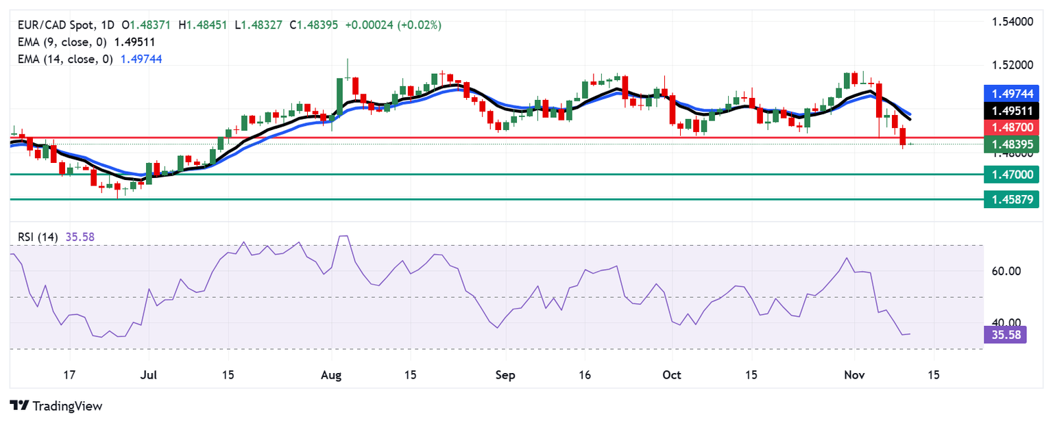 The EUR/CAD cross attempts to halt its two days of losses, trading around 1.4840 during the Asian session on Tuesday. An analysis of the daily chart highlights a strong bearish bias, as the pair remains below the nine-day Exponential Moving Average (EMA).