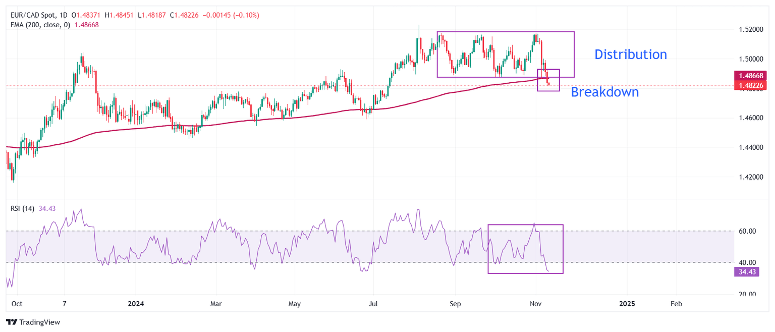 EUR/CAD delivers a breakdown of the Distribution formation on a daily timeframe in which the asset is transferred from institutional investors to retail participants, which results in a bearish reversal. The longer-term trend of the asset has also turned bearish as it has slipped below the 200-day Exponential Moving Average (EMA), which trades around 1.4866.