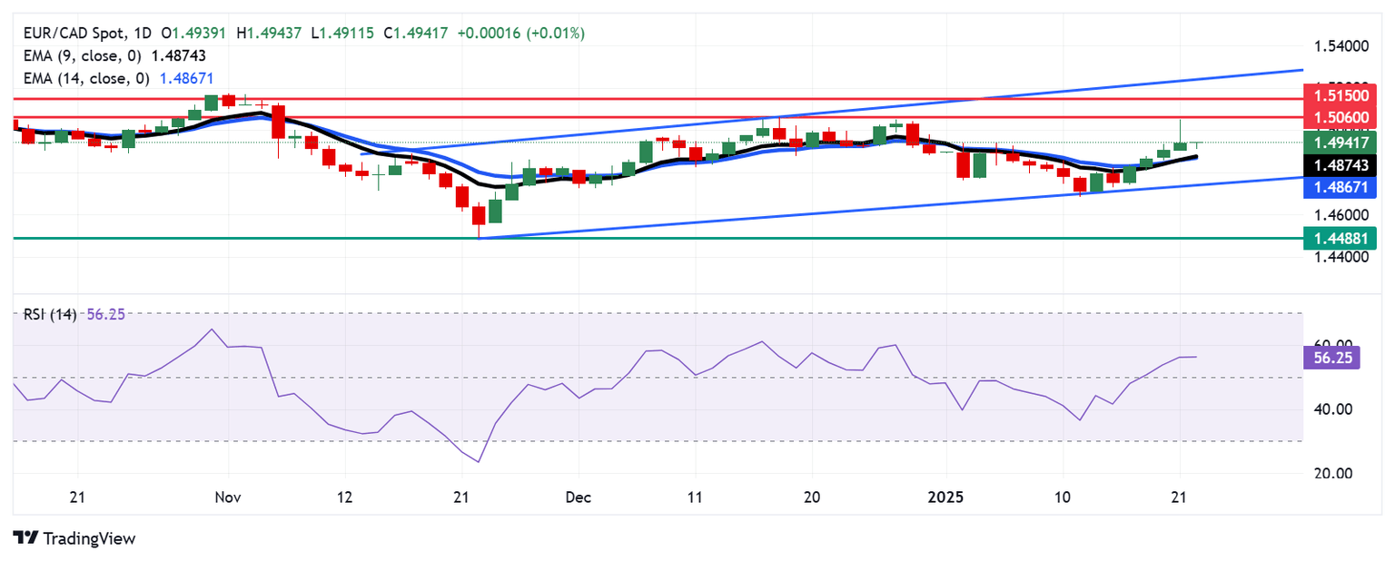 EUR/CAD ends its four-day losing streak, trading near 1.4940 during European trading hours on Wednesday. Technical analysis on the daily chart points to a bullish bias, with the currency cross continuing to trade within an ascending channel pattern.