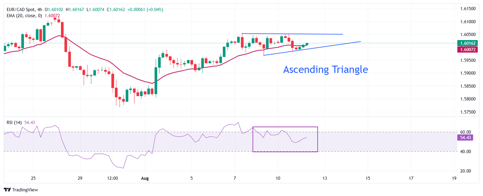 EUR/CAD trades in an Ascending Triangle formation on a four-hour timeframe after a strong rally in last two weeks. The horizontal border of the above-mentioned chart pattern is placed from the August 7 high around 1.6055, while the upward-sloping border is plotted from the August 8 low of 1.5970.