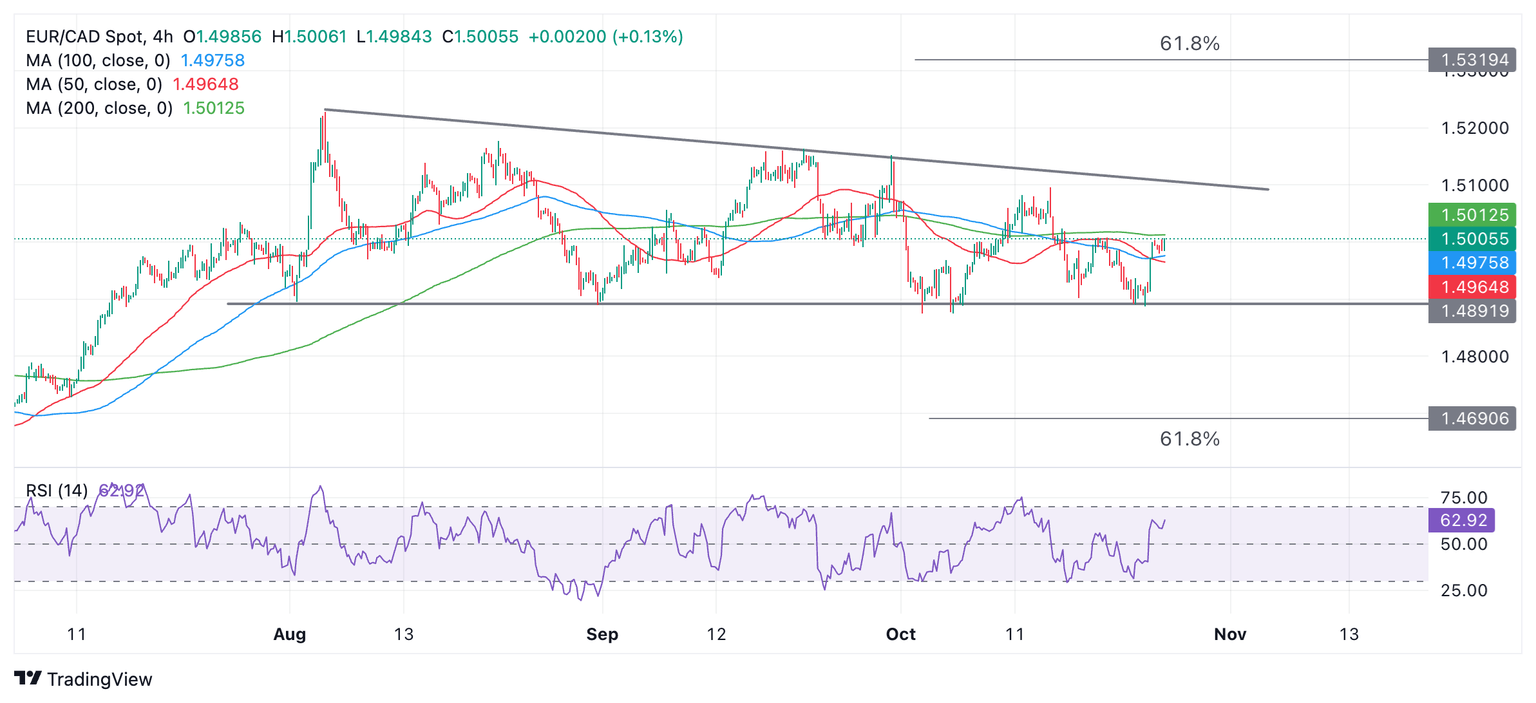 EUR/CAD lengthens its range-bound price action on Friday, trading at 1.5000 after edging higher on the day. The pair is plum in the center of an 11-week range and unable to gain directionality due to the similar monetary policy outlook of the two currencies’ central banks.