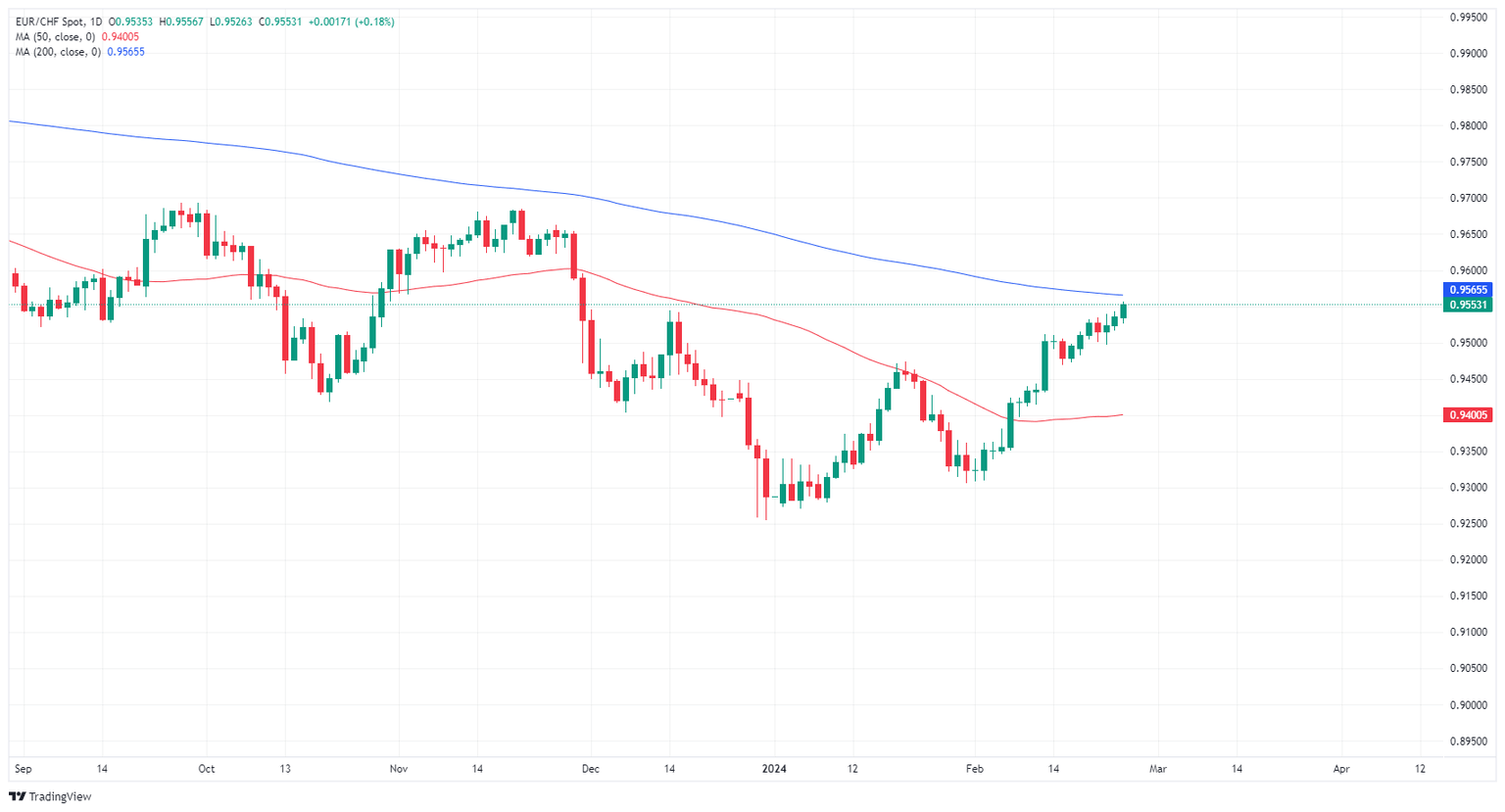 EUR/CHF knocked into fresh multi-month highs on Monday as the pair steps into a ten-week peak above 0.9550. The Swiss Franc (CHF) has depreciated notably against the majority of its major currency peers in 2024, and is down 2.88% YTD against the Euro (EUR).