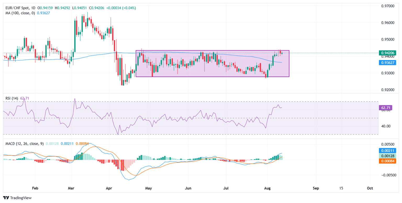 - EUR/CHF holds steady above 0.9400, consolidating recent gains after rebounding from the lower boundary of a multi-month range around 0.9300.