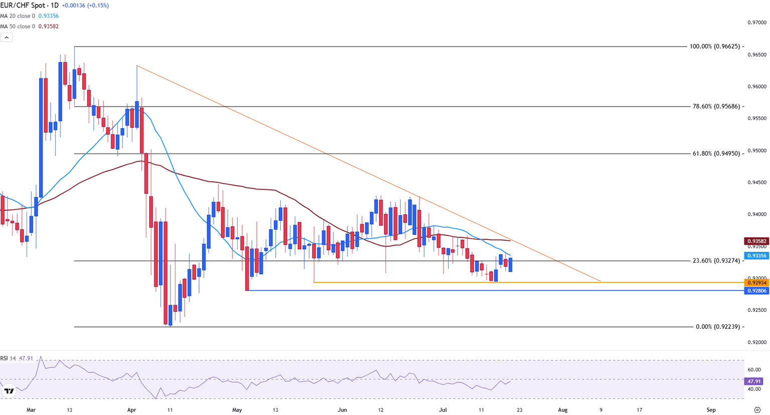 With EUR/CHF currently testing the 23.6% Fibonacci retracement level of the March-April decline at 0.9327, the falling trendline from the April rally remains intact, reinforcing a broader bearish bias.