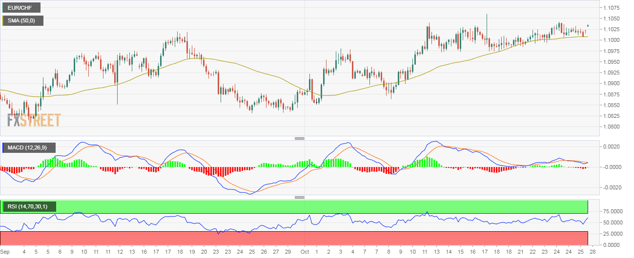 EUR/CHF is better bid at 1.1030 press time and could challenge the Oct. 17 high of 1.1059 in the next 24 hours.