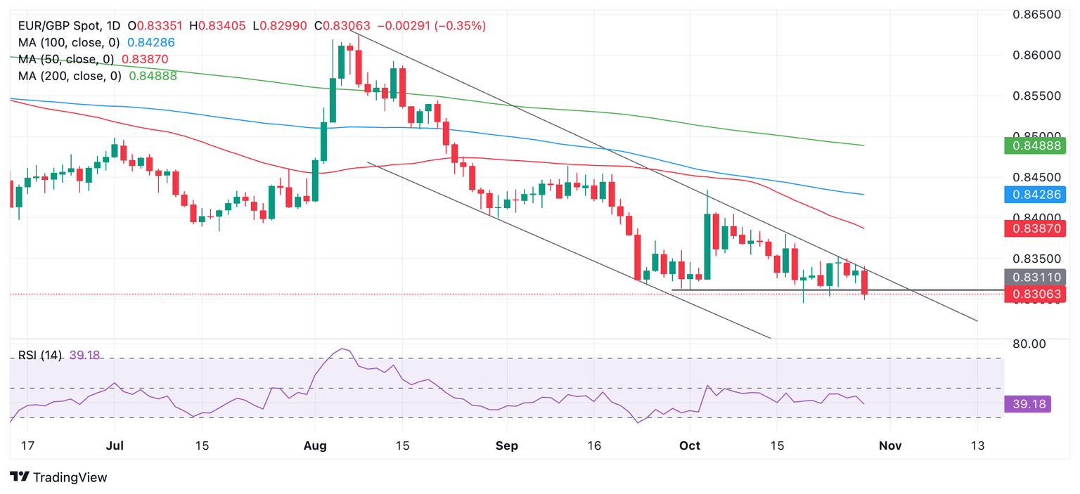 EUR/GBP exchanges hands just above 0.8300 on Tuesday, down a quarter of a percent on the day and close to the two-and-a-half year lows of 0.8295 set on October 18. A break below these lows would be a considerable bearish development.