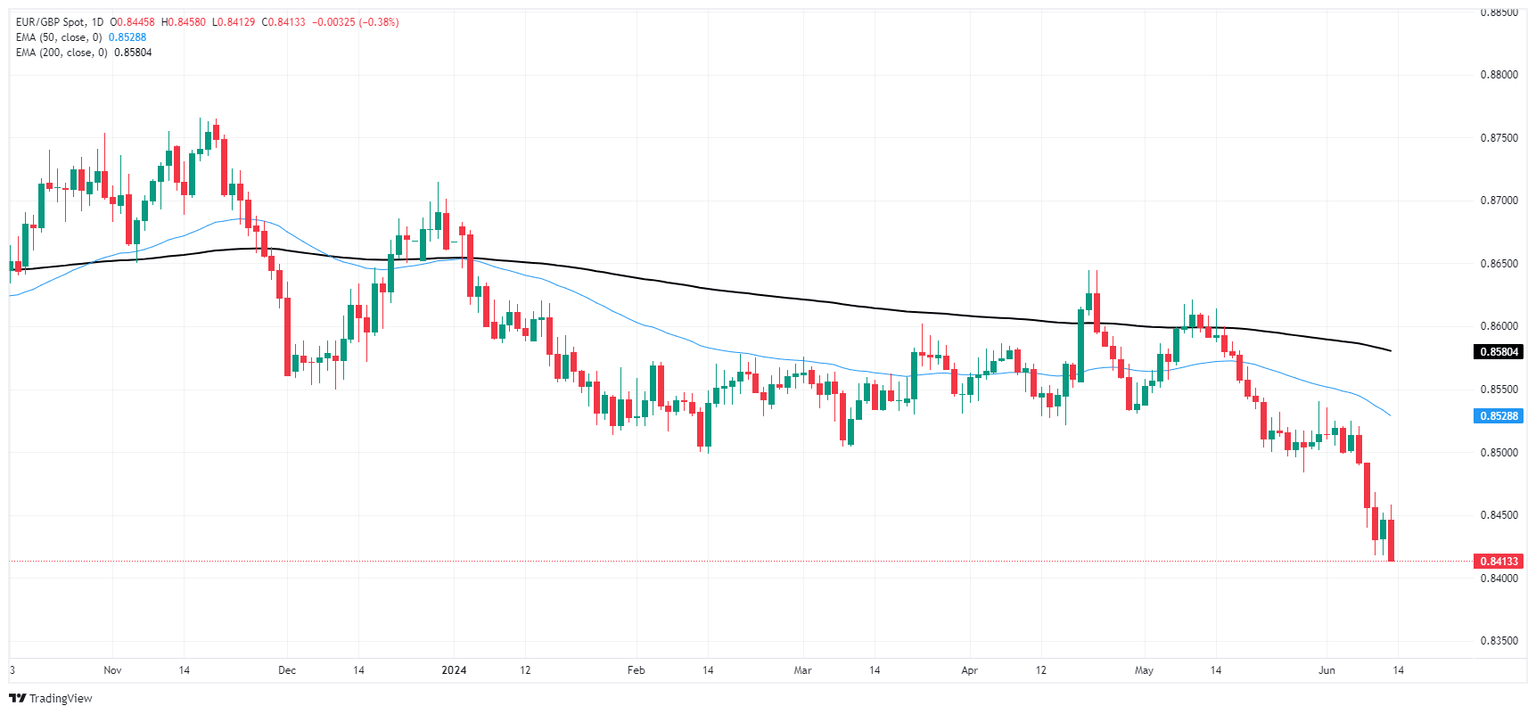 EUR/GBP is accelerating towards the downside away from the 200-day Exponential Moving Average (EMA) at 0.8581. The pair is down 3% from 2024’s opening bids, and major resistance is priced in even further down at 0.8300.