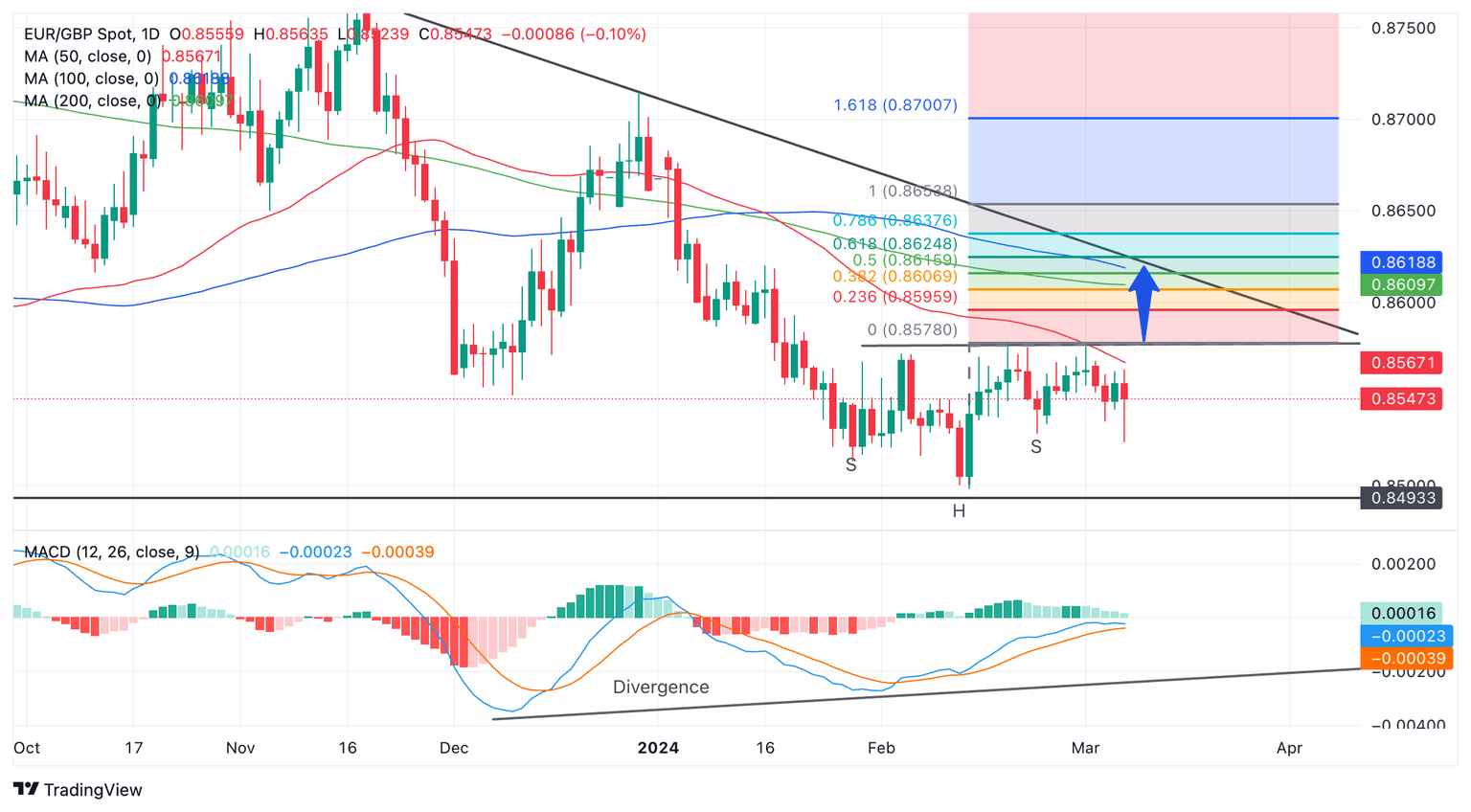 Given the confluence of resistance from the 100 and 200-day Simple Moving Averages (SMA) at around 0.8615, as well as resistance from the trendline nearby, this zone provides a potential conservative estimate for the pattern, although it may well go higher if accompanied by a major shift in fundamentals.