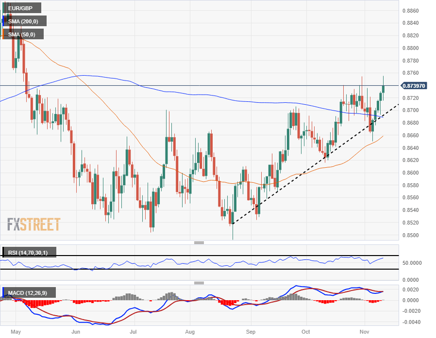 The EUR/GBP wraps up another trading week just shy of 0.8750 after seeing five straight days of gains with the Pound Sterling (GBP) waffling against the Euro (EUR) for the entire week.