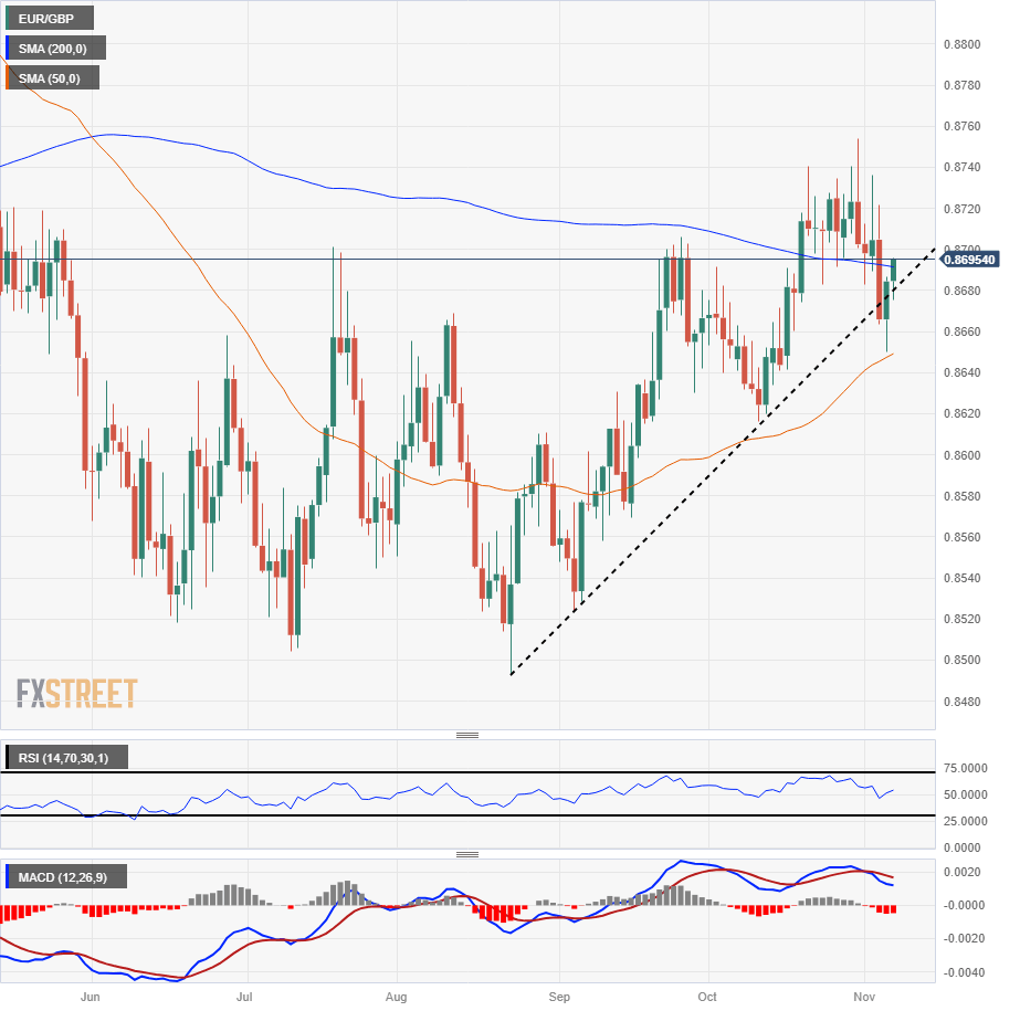 The EUR/GBP is clawing back into the topside after recently tumbling out of consolidation, and the pair is set to confirm a daily close back over the 200-day Simple Moving Average (SMA) near 0.8690.