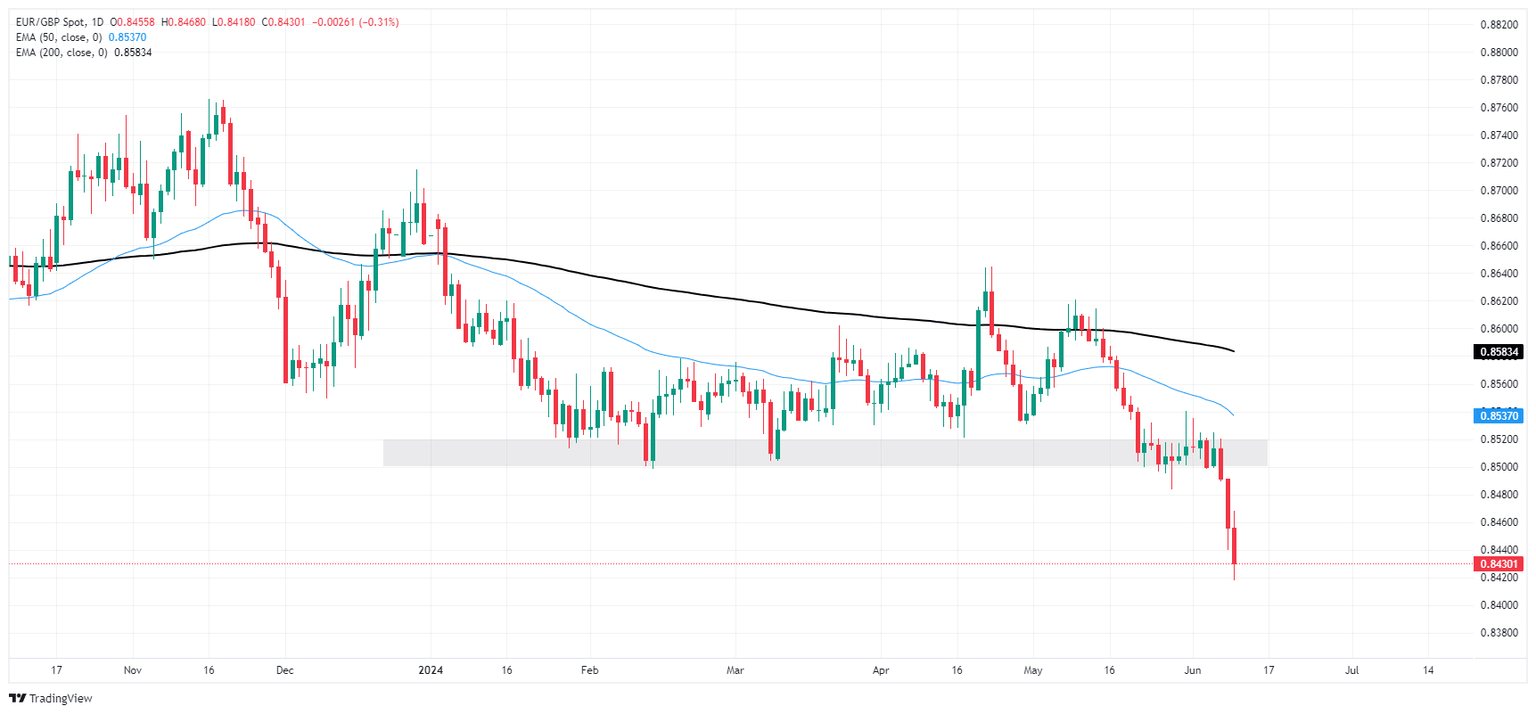 Tuesday’s declines are just a capstone on recent bearish pressure pushing the pair lower. EUR/GBP has closed flat or down for four straight weeks, and is firmly on pace to chalk in a fifth. The 200-day Exponential Moving Average (EMA) is turning bearish from 0.8617, and any bullish recoveries will run aground of familiar technical consolidation levels above the 0.8500 handle.