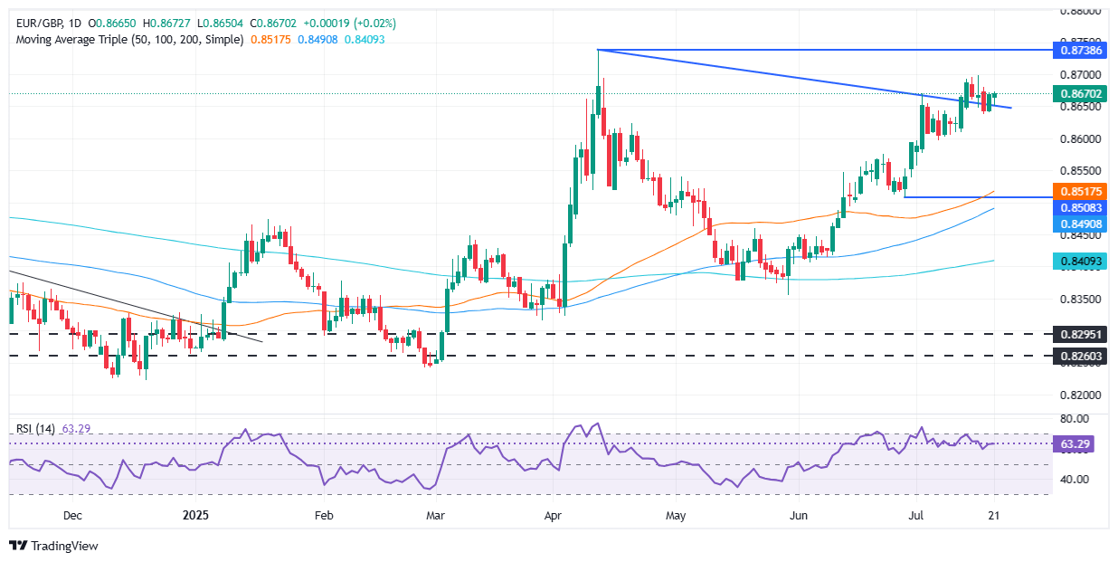 For a bullish continuation, traders need to surpass the 0.8700 figure so that they can challenge the year-to-date (YTD) high of 0.8738. A breach of the latter will expose 0.8750 and 0.8800. On the other hand, if EUR/GBP falls below 0.8650, expect a decline toward the 20-day SMA at 0.8617, followed by a potential drop to 0.8600.