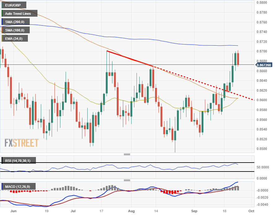The EUR/GBP slipped in Monday trading to test the 0.8670 region, and intraday technical support currently sits at the 100-hour Simple Moving Average (SMA) near 0.8660, with a rising trendline marked into hourly candles from last week's swing low into 0.8610.