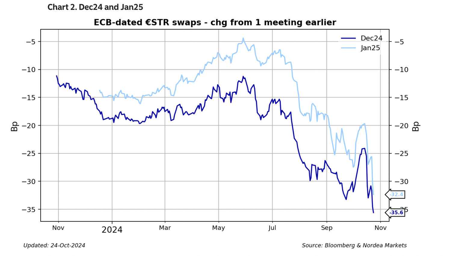 According to Larsson, the market is pricing in “-35.6bp for the December ECB meeting and -32.4bp for the ECB meeting on 25 January.” This is substantially higher than a few weeks ago.