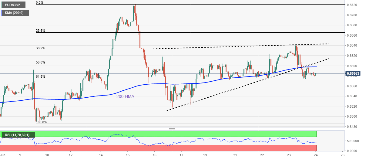 EUR/GBP picks up bids to 0.8590 while consolidating the biggest daily loss in a week during Friday’s Asian session. In doing so, the cross-currency pair rebounds from the 61.8% Fibonacci retracement of June 09-15 upside.