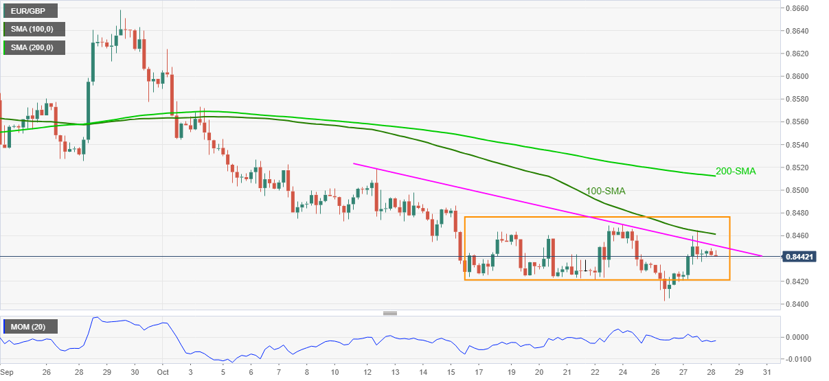 EUR/GBP remains sidelined around 0.8445, keeping a two-week-long trading range as European traders brace for the key Thursday.