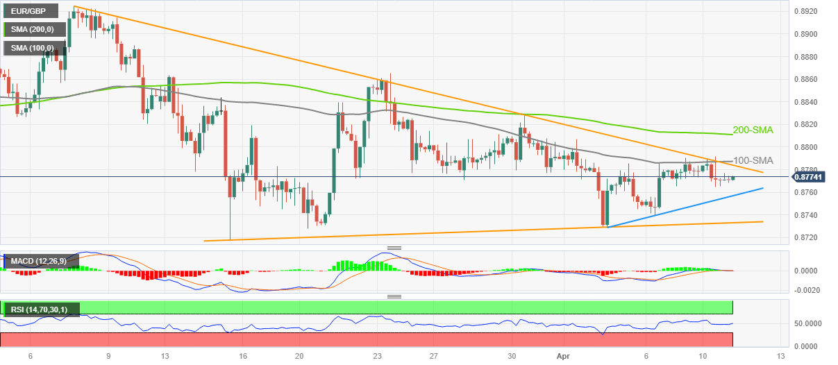 As a result, a slower grind towards a downward-sloping resistance line from early March, around 0.8785, can’t be ruled out. However, the 100-SMA level of 0.8790, and the 0.8800 round figure could challenge the EUR/GBP bulls afterward.