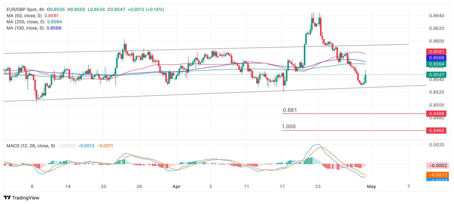 EUR/GBP price has fallen to 0.8530, one pip above the base of a multi-month range at 0.8530.