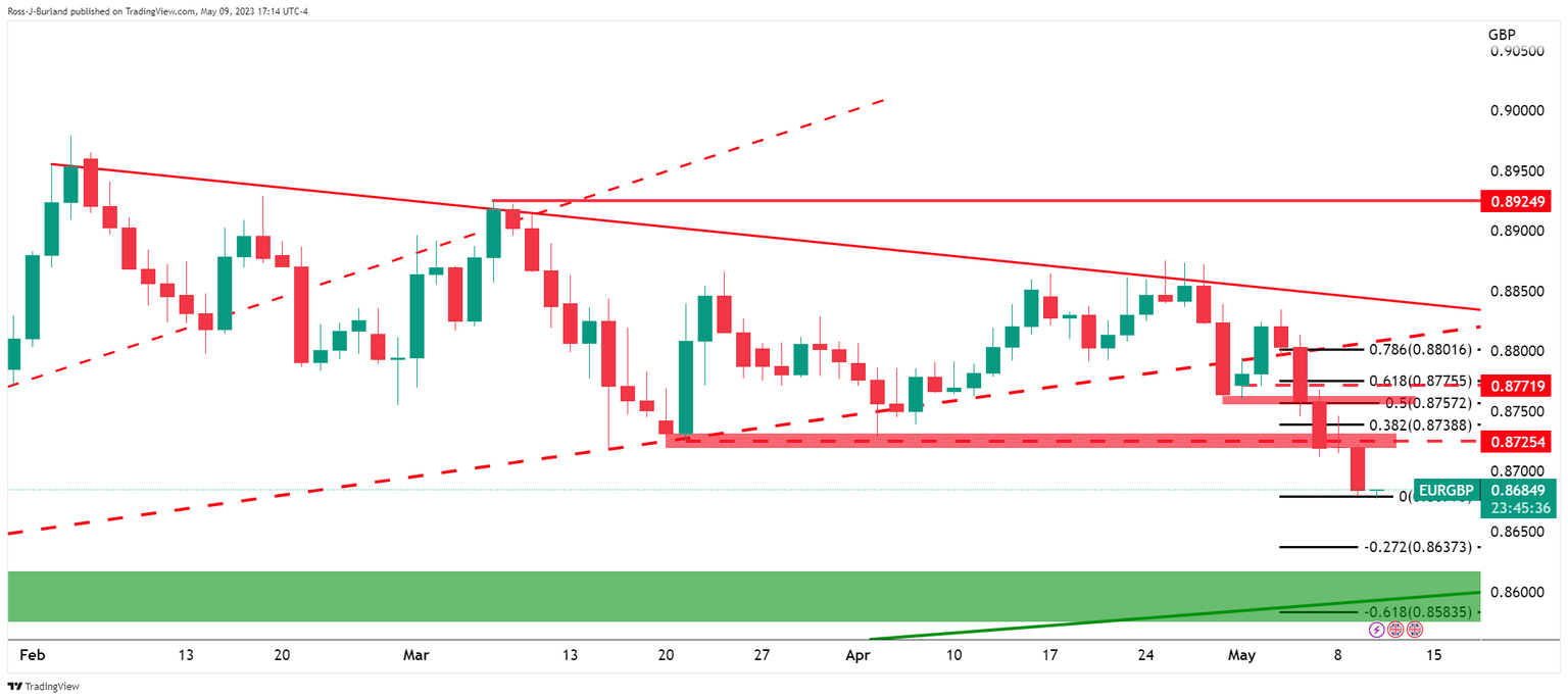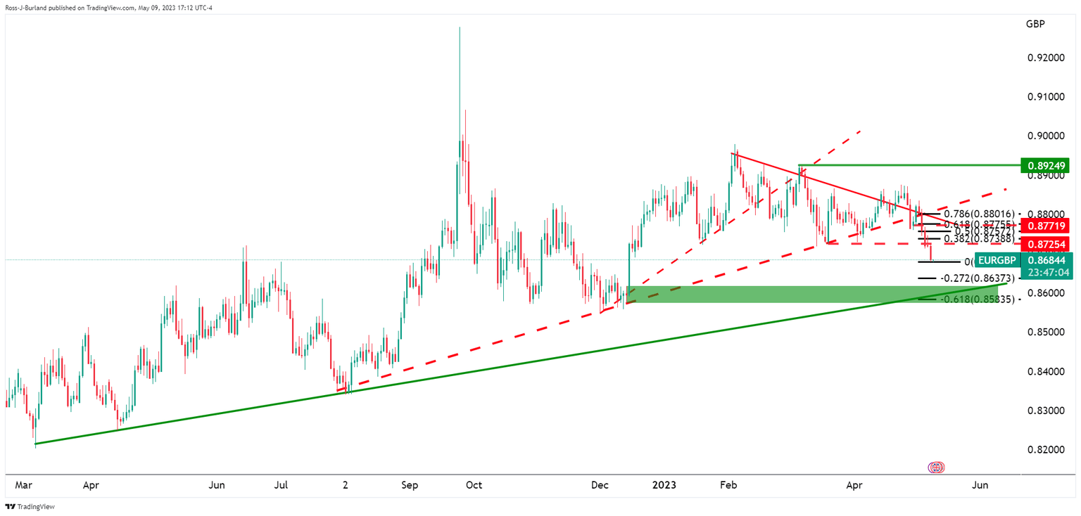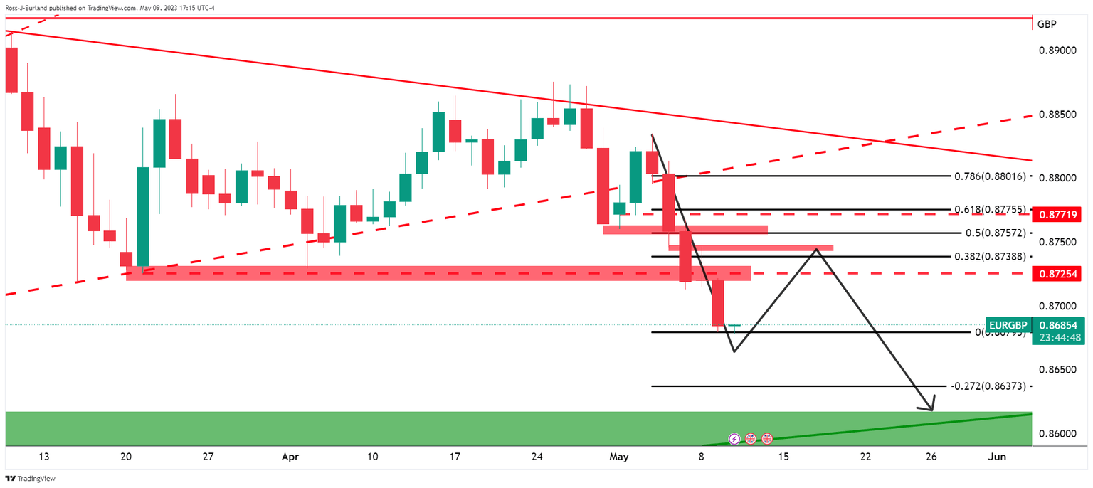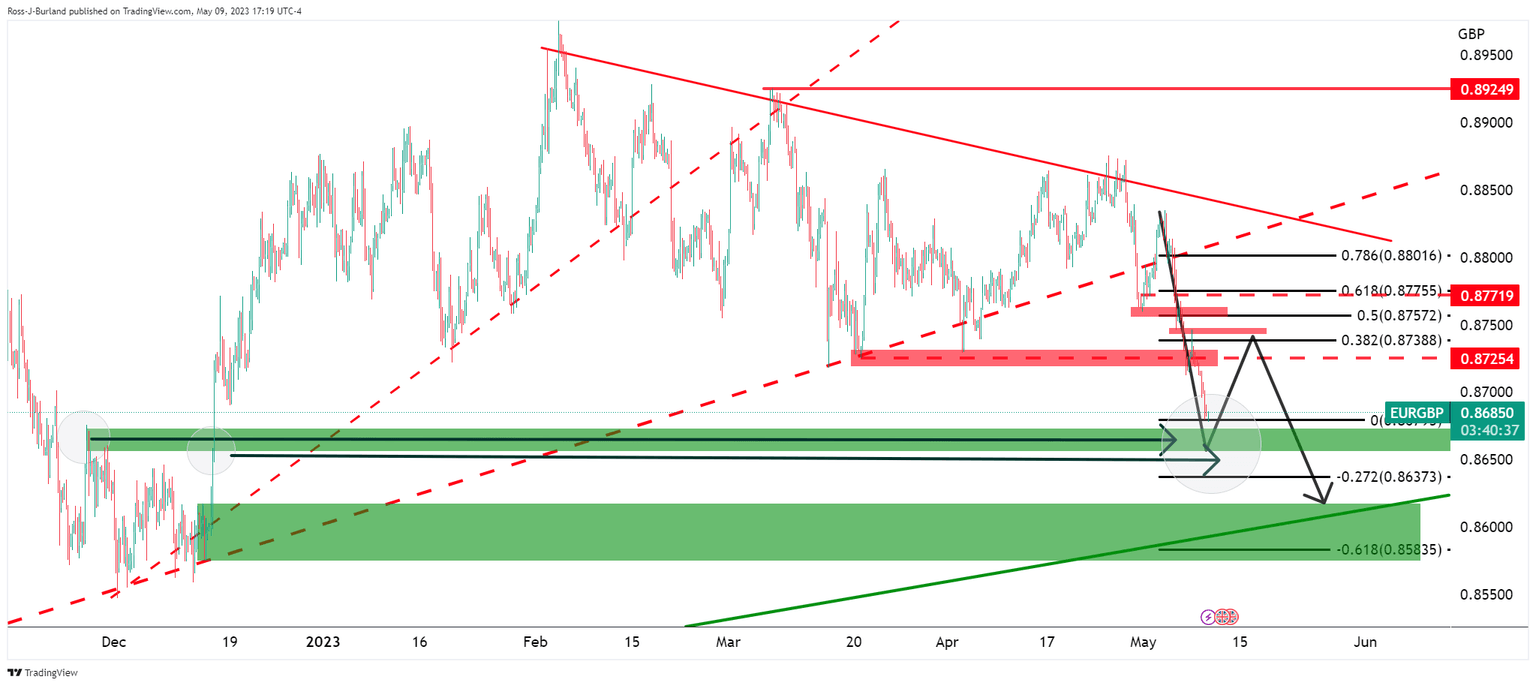 - EUR/GBP bears are in the market but bulls could be lurking.
