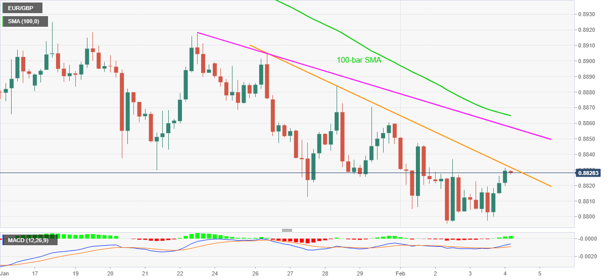 EUR/GBP takes bids near the intraday high of 0.8831 ahead of Thursday’s European session. The pair marked a corrective pullback during the last two days that currently battles a resistance line from January 26.