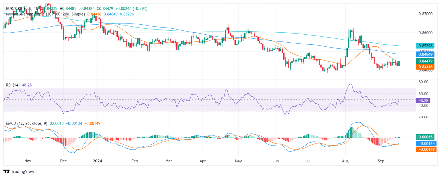 In Tuesday's session, the EUR/GBP rose by 0.28% to 0.8450 and extended its sideways trading range tracking the narrow-range movements of the past sessions. A break above the 20-day Simple Moving Average (SMA) which convergences at 0.8450, would confirm a break of the side-ways movements.
