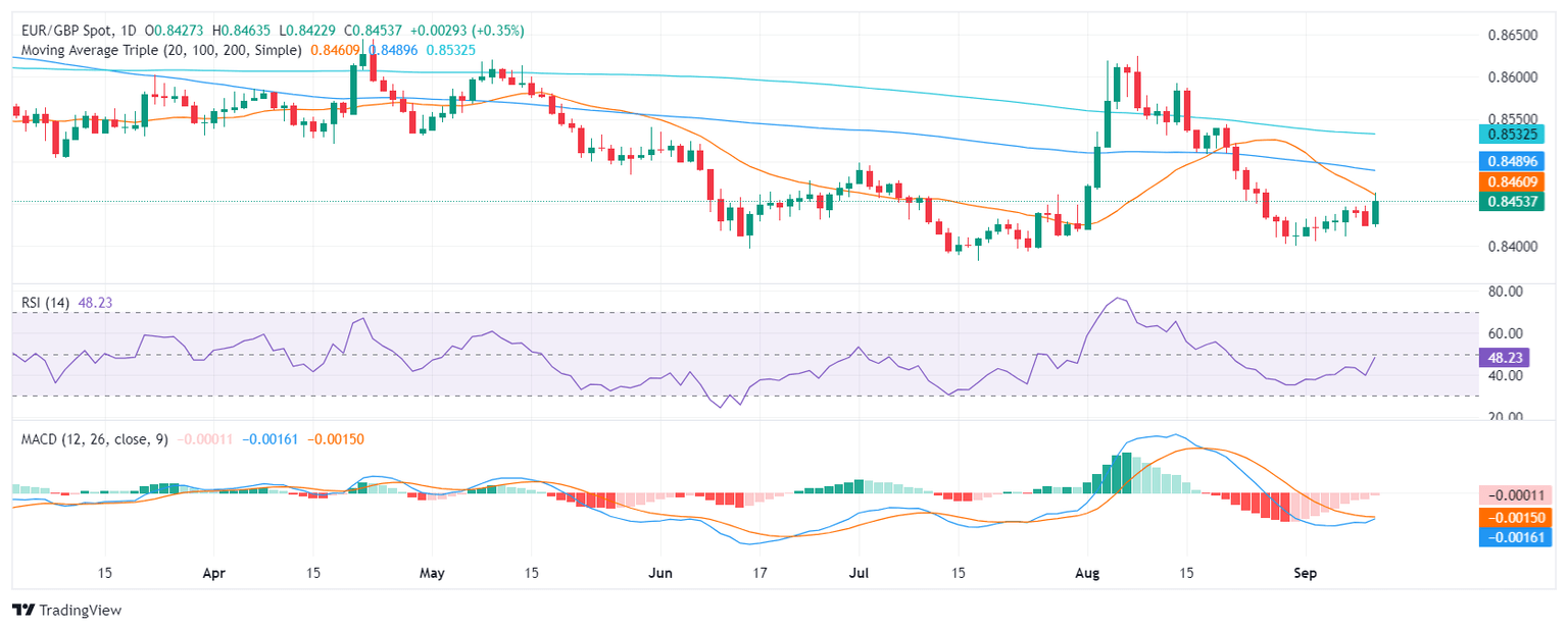 However, the overall outlook remains cautious as the choppy and price action in recent candles suggests consolidation for the pair. While the pair has been holding above the 0.8400 support level, the next resistance level to watch is 0.8460 at the 20-day Simple Moving Average (SMA) and a break above could confirm a recovery.