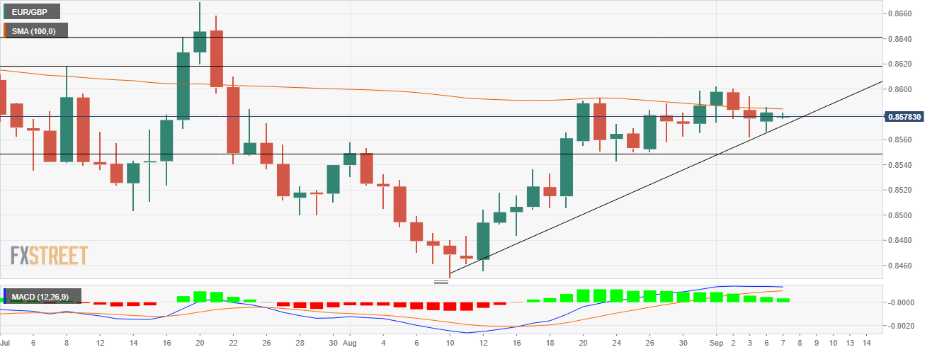 On the daily chart, the EUR/GBP cross has been in the constant upside momentum after making a low of 0.8450 on August 10. However, the price faces some consolidation near 0.8580 with multiple top formations.
