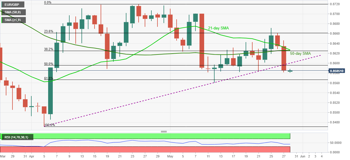 EUR/GBP struggles to recover from a two-week low while taking rounds to 0.8585 during Friday’s Asian trading session. In doing so, the cross-currency pair keeps the previous day’s downside break of an ascending trend line from early April.